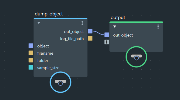 まずはdump_objectノードを図のように繋いでテキストが出力されるようFilenameやFolderを設定します。