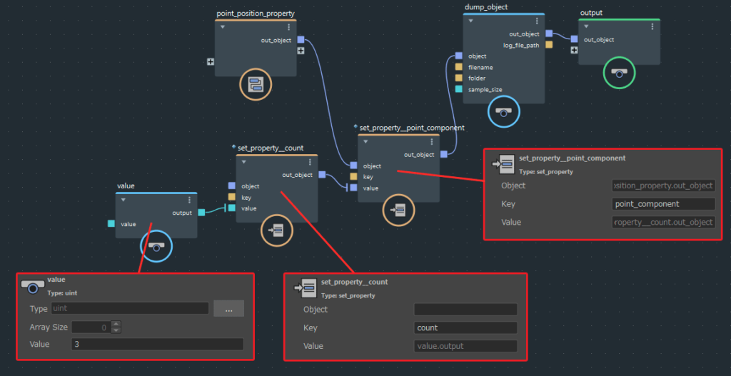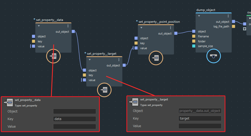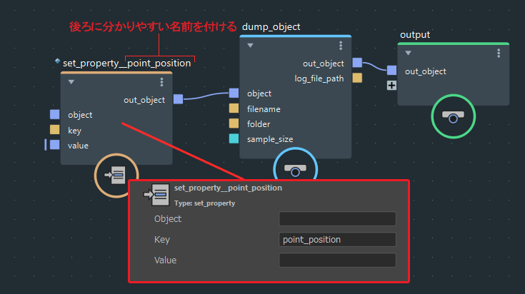 図のように「set_property」ノードを作成してdump_objectノードに接続します。
