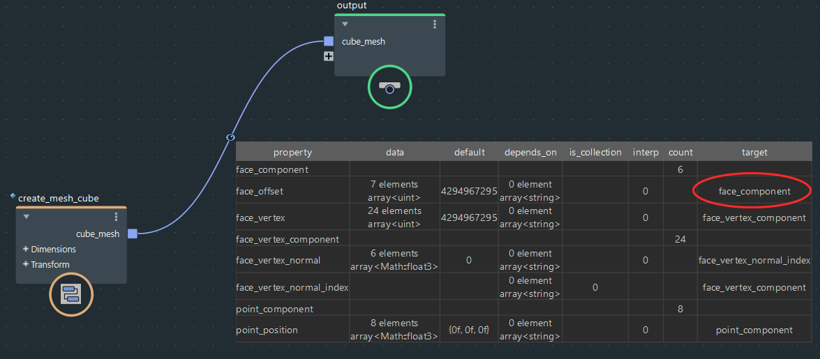既存のcreate_mesh_cubeノードとかは逐一set_propertyノードで指定する面倒くさいやり方をしているのかなー、というと、そうでもなく中身を探っていくと「construct_mesh」ノードというのが使われているのが分かります。