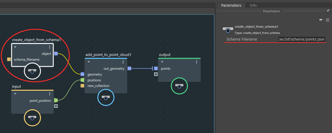 中身を開くと図のような感じで、add_point_to_point…と書いてあるノードはpoint_positionを設定するノードだと思われるので、赤丸の「create_object_from_schema」ノードが大元のテンプレートのノードっぽいです。